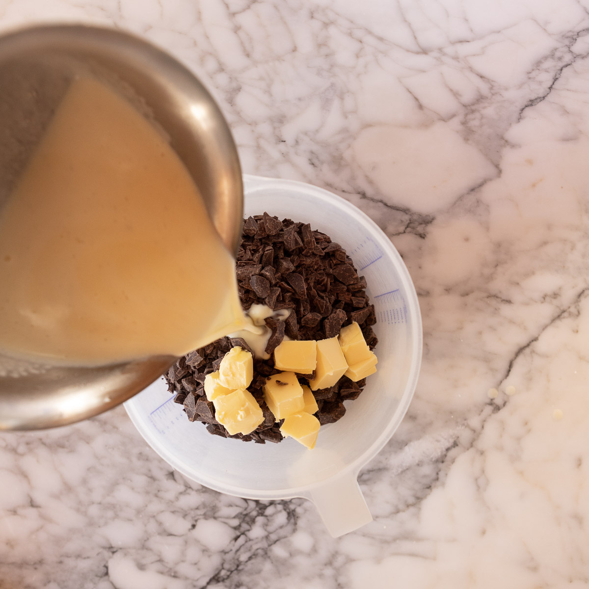 - Pour the hot cream mixture over the chocolate and butter. Let it sit for 2 minutes so the chocolate softens.