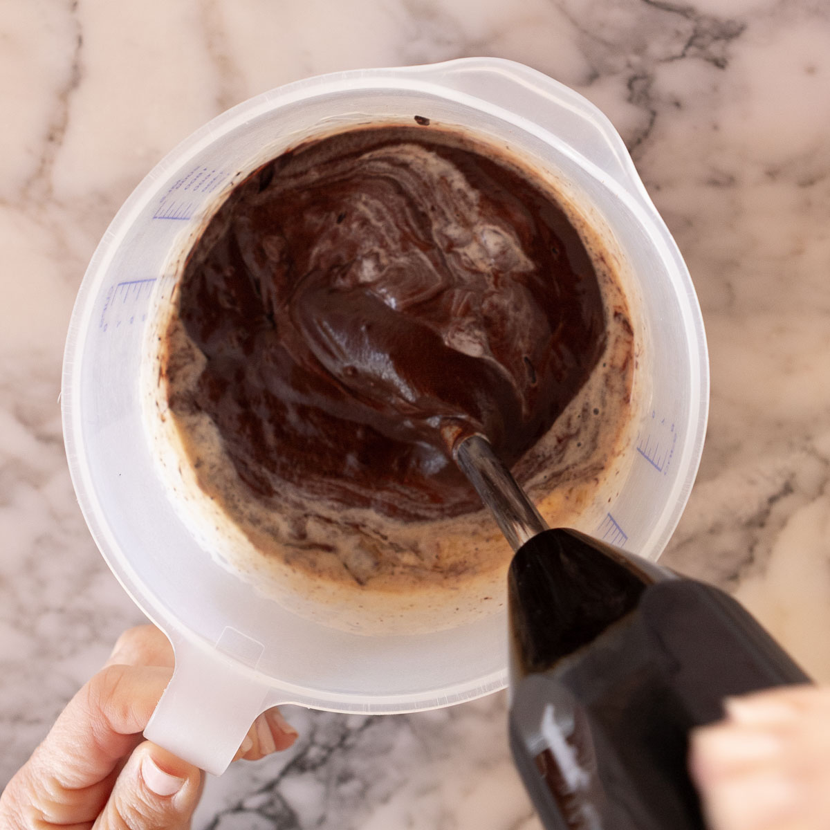 - Using a stick blender, blend from the centre outward until the ganache is completely smooth and glossy. Avoid incorporating too much air.